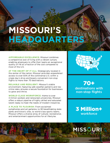 Missouri is an ideal location for corporate headquarters, offering a central U.S. location, skilled workforce, and pro-business climate to support long-term success.