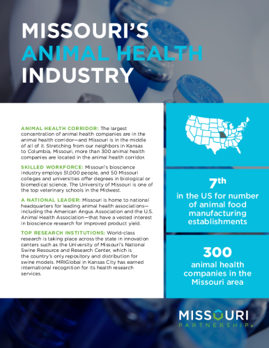 Missouri is home to national headquarters for leading animal health associations— including the American Angus Association and the U.S. Animal Health Association—making it one of the top places in the world for animal health companies.